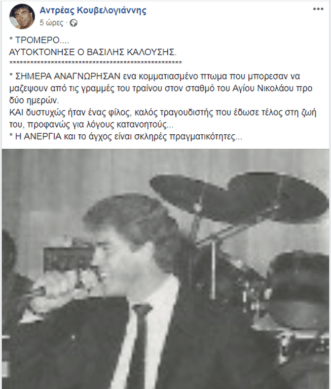 «Τρομερό. Αυτοκτόνησε ο Βασίλης Καλούσης. Σήμερα αναγνώρισαν ένα κομματιασμένο πτώμα που μπόρεσαν να μαζέψουν από τις γραμμές του τραίνου στον σταθμό του Αγίου Νικολάου προ δύο ημερών. ΚΑΙ δυστυχώς ήταν ένας φίλος, καλός τραγουδιστής που έδωσε τέλος στη ζωή του, προφανώς για λόγους κατανοητούς… Η ανεργία και το άγχος είναι σκληρές πραγματικότητες…», γράφει στην ανάρτησή του.
