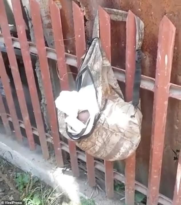 Το σοκαριστικό βίντεο που τραβήχτηκε από περαστικούς δείχνει το μωρό μετά βίας να έχει τις αισθήσεις του μέσα σε μια σακούλα που κρέμεται σε έναν φράχτη στις Φιλιππίνες.