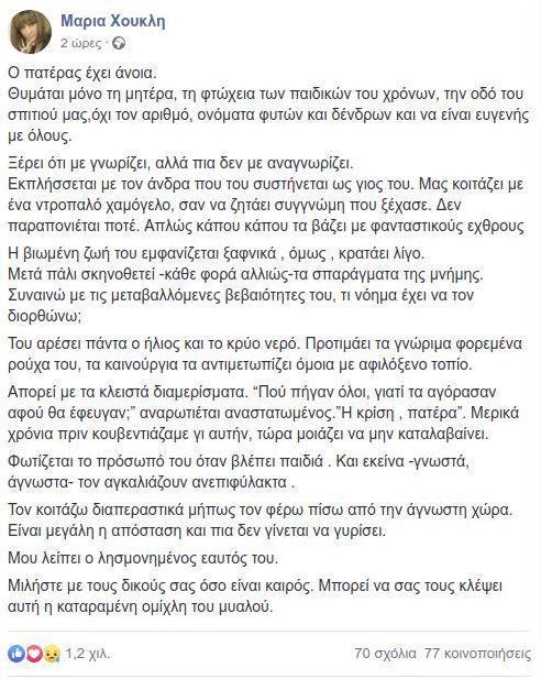 Μία συγκλονιστική ανάρτηση δημοσίευσε η δημοσιογράφος Μαρία Χούκλη για τον πατέρα της, αφορμώμενη από τη Γιορτή του πατέρα. Μίλησε για το πρόβλημα υγείας που αντιμετωπίζει και ραγίζει καρδιές με τα λόγια της.