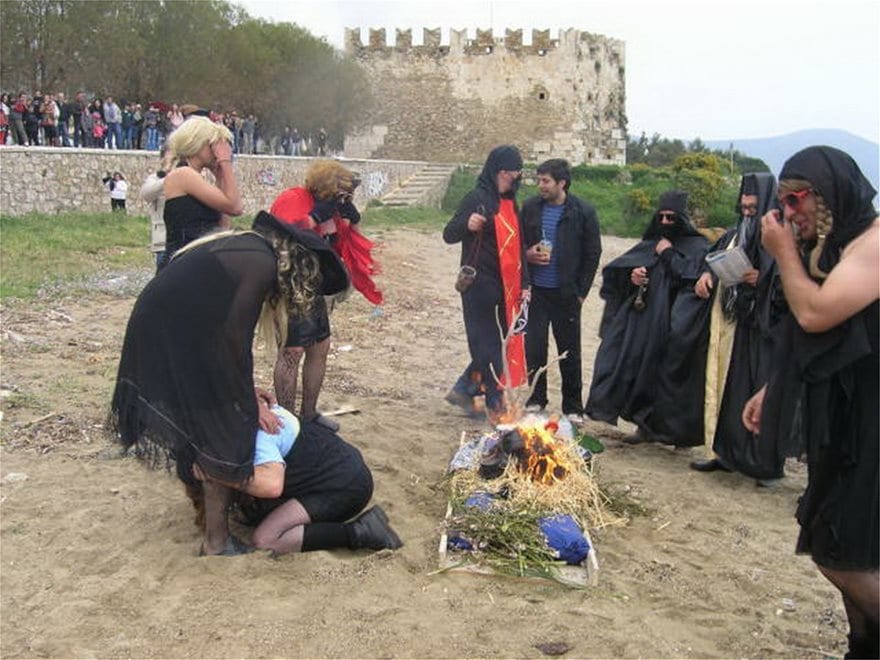 Αφού ετοιμάσουν τον νεκρό ετοιμάζονται και οι «γυναίκες» που θα τον μοιρολογήσουν. Ακολουθούν την πομπή στην οποία προηγείται ο παπάς και οι ψαλτάδες που ψέλνουν νεκρώσιμα μεν, αλλά παραλλαγμένα με πολύ καυστικό τρόπο δε, πίνοντας και οδυρόμενοι. Στη συνέχεια στήνεται τρικούβερτο γλέντι όπου όλοι χορεύουν κρατώντας το «νεκρό» ψηλά και πίνοντας μέχρι τελικής πτώσεως.