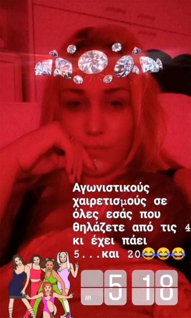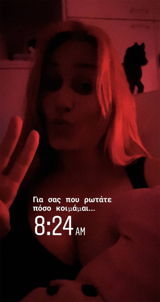 «Αγωνιστικούς χαιρετισμούς σε όλες εσάς που θηλάζετε από τις 4 και έχει πάει 5 και 20». Ενώ στις 8:24 κοινοποίησε ακόμα μία φωτογραφία που έγραφε «Σε όσους με ρωτάτε πόσο κοιμάμαι».