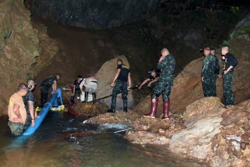 Οι διασώστες προσπαθούσαν από το πρωί σήμερα να ανοίξουν έναν στενό διάδρομο για να περάσουν δύτες μέσα στο πλημμυρισμένο σπήλαιο.
