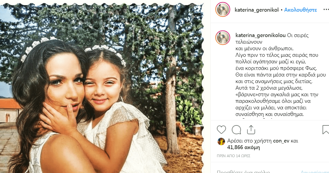Ωστόσο τα γυρίσματα έχουν ήδη ολοκληρωθεί, ενώ βλέπουμε διάφορες αναρτήσεις των ηθοποιών με φωτογραφίες και συγκινητικά λόγια για το διετές αυτό ταξίδι τους. Μεταξύ αυτών και η Κατερίνα Γερονικολού, η “μητέρα” της τηλεοπτικής Λήδας, η οποία μίλησε με τα πιο τρυφερά λόγια για το κοριτσάκι που όλοι αγαπήσαμε και είδαμε να εξελίσσεται και να μεγαλώνει αυτά τα δύο χρόνια!