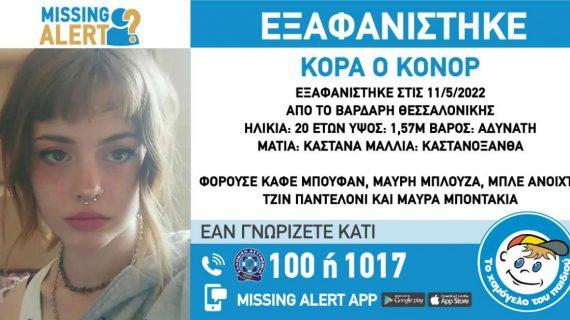 «Στις 11/5/22, εξαφανίστηκε από την περιοχή του Βαρδάρη στην Θεσσαλονίκη η Κόρα Ο Κόνορ, 20 ετών. Το «Χαμόγελο του Παιδιού» ενημερώθηκε για την εξαφάνιση της Κόρα Ο Κόνορ στις 11/5/2022 και προχώρησε στη δημοσιοποίηση των στοιχείων της ενήλικης σύμφωνα με το reader.gr καθώς συντρέχουν λόγοι οι οποίοι θέτουν τη ζωή της σε κίνδυνο.