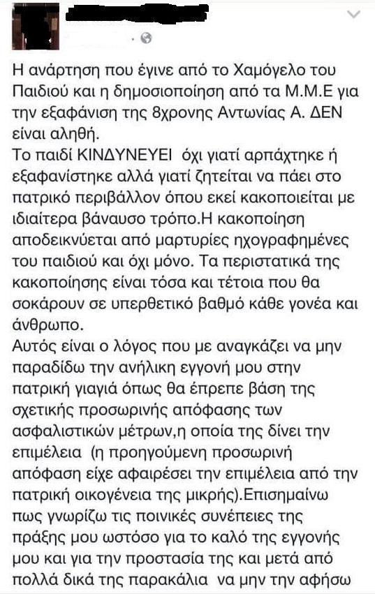 Ωστόσο, χθες σε μια σοκαριστική ανάρτηση η γιαγιά της μικρής (από την πλευρά της μητέρας της) δηλώνει ότι το παιδί είναι καλά και ότι δεν πρόκειται να αποκαλύψει πού βρίσκεται γιατί δεν πρέπει να επιστρέψει στο πατρικό της περιβάλλον καθώς εκεί «η μικρή Αντωνία κακοποιούνταν με βάναυσο τρόπο» -όπως η ίδια η γιαγιά ισχυρίζεται.