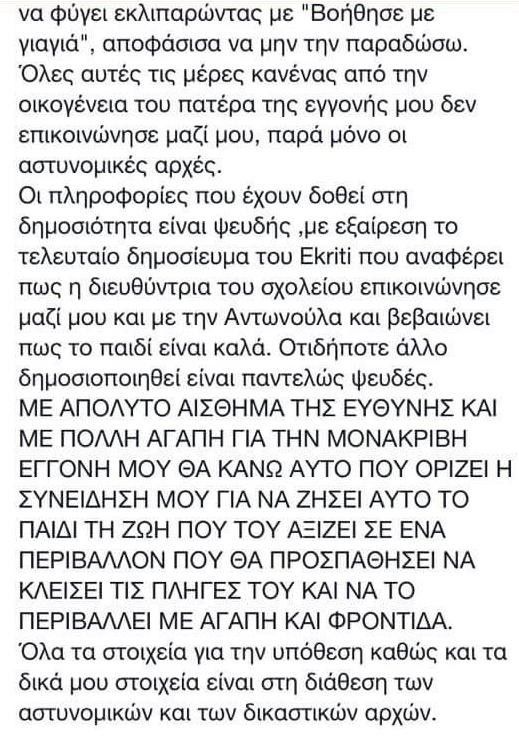 Έγραψε στο Facebook ότι δεν θα παραδώσει την μικρή στη μητέρα του γαμπρού της γιατί δεν πρέπει να επιστρέψει στο πατρικό της περιβάλλον καθώς εκεί «κακοποιούνταν με βάναυσο τρόπο»