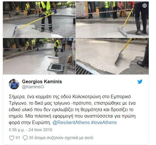 Η επίστρωση με το υλικό CoolSeal πραγματοποιήθηκε την Κυριακή σε τμήμα της οδού Κολοκοτρώνη στο Εμπορικό Τρίγωνο της πρωτεύουσας, με τον δήμαρχο Αθηναίων Γιώργο Καμίνη να κάνει λόγο για «μία πιλοτική εφαρμογή που αναπτύσσεται για πρώτη φορά στην Ευρώπη».