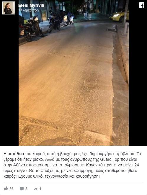 «Η αστάθεια του καιρού, αυτή η βροχή, μας έχει δημιουργήσει πρόβλημα. Το ξέραμε ότι ήταν ρίσκο. Αλλά με τους ανθρώπους της Guard Top που είναι στην Αθήνα αποφασίσαμε να το τολμίσουμε. Κανονικά πρέπει να μείνει 24 ώρες στεγνό. Θα το φτιάξουμε, με νέα εφαρμογή, μόλις σταθεροποιηθεί ο καιρός! Έχουμε υλικό, τεχνογνωσία και καθοδήγηση!», έγραψε στο facebook η αρμόδια αντιδήμαρχος.