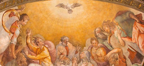 Σύμφωνα με την Καινή Διαθήκη, 10 ημέρες μετά την Ανάληψη του Χριστού και 50 ημέρες μετά την Ανάσταση, οι Δώδεκα Απόστολοι ήταν συγκεντρωμένοι σε ένα σπίτι στα Ιεροσόλυμα. Εκείνη την ημέρα ήταν η εβραϊκή γιορτή της Πεντηκοστής, ημέρα που γιορτάζουν το ότι ο Θεός έδωσε στον Μωυσή τις Δέκα Εντολές στο Όρος Σινά. Ξαφνικά, ακούστηκε μία δυνατή βροντή στον ουρανό και όλοι είδαν δώδεκα γλώσσες που θύμιζαν φωτιά να κατεβαίνουν από τον ουρανό και να μπαίνουν στο σπίτι όπου βρίσκονταν οι Απόστολοι. Κάθε μία από τις γλώσσες στάθηκε πάνω από το κεφάλι του κάθε Απόστολου. Κατά τον Αγ. Γρηγόριο Παλαμά, με αυτές τις πύρινες γλώσσες πήρε μορφή το Αγ. Πνεύμα.