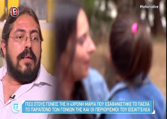 Την πρώτη τους τηλεοπτική εμφάνιση έκαναν οι γονείς της μικρής Μαρίας, οι οποίοι μιλησαν σε γνωστή τηλεοπτική εκπομπή, δίνοντας τη δική τους εικόνα για το πώς εξαφανίστηκε το 4χρονο κοριτσάκι. Η εξαφάνιση του παιδιού είχε δημιουργήσει σάλο και μέχρι σήμερα, που το παιδί έχει επιστρέψει πλέον στους γονείς του, η υπόθεση εξακολουθεί να προβληματίζει, καθώς δεν έχει γίνει σαφές τι ακριβώς συνέβη τότε. Το νέο στοιχείο το οποίο γνωστοποίησαν στην εκπομπή οι δύο γονείς, είνει εκείνο το οποίο αναφέρει έναν κύριο που θα έφερνε το παιδί στους γονείς. Σύμφωνα με τη μητέρα, η κόρη της της είπε για “έναν κύριο ψεύτη που θα την έφερνε σε εμένα”. Στο σημείο εκείνο η μητέρα είπε πως το κοριτσάκι έχει πει περισσότερα στον θείο και στη θείς. Σύμφωνα με τον πατέρα: “Στην αδελφή μου έχει πει περισσότερα, για αυτοκίνητα και μία κυρία…”. Επιπλέον ο πατέρας υποστηρίζει πως αποκλείεται να ήταν μονο του το παιδί διότι βρέθηκε καθαρό, δεν ήταν βρώμικο, ενώ συγχρόνως τα ρούχα που φορούσε είχαν κουμπάκια τα οποία δεν μπορούσε να τα ανοίξει μόνο του. Αμφότεροι οι γονείς σημειώνουν ότι ξεκίνησαν να ψάχνουν την κόρη τους πολύ γρήγορα, σχεδόν αμέσως και απορρίπτουν τις κατηγορίες για ολιγωρία και αμέλεια. Δείτε το βίντεο με τη συνέντευξη τους στην εκπομπή “Tatiana live” στον τηλεοπτικό σταθμό Ε.