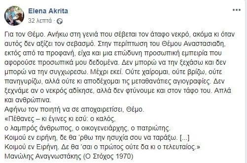 Η Έλενα Ακρίτα αποχαιρέτησε τον Θέμο Αναστασιάδη με ένα μήνυμά της στο facebook.