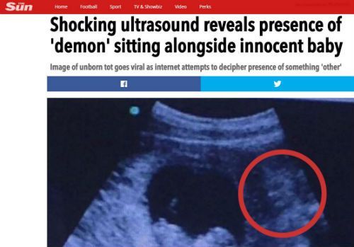 «Σοκαριστικό υπερηχογράφημα αποκαλύπτει την παρουσία «δαίμονα» δίπλα σε αθώο μωρό», είναι ο τίτλος της Sun για το θέμα!