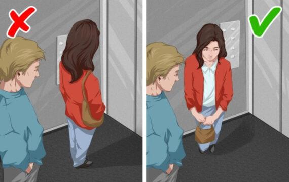 Όταν μπαίνετε στο ασανσέρ και έχει χώρο επιλέξτε να κάτσετε προς τον πίνακα με το βλέμμα σας στραμμένο προς τους υπολοίπους και όχι προς τη πόρτα ως συνήθως. Με αυτόν τον τρόπο θα μπορείτε πιο εύκολα να επιβλέπετε τη κατάσταση.