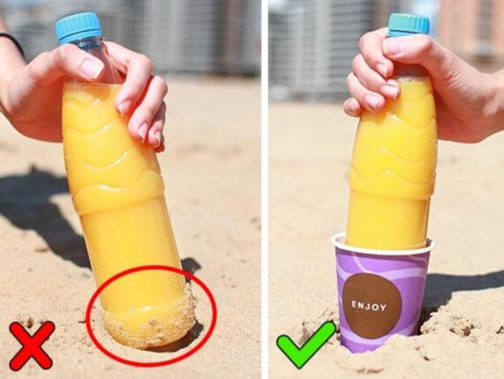 Τι να κάνετε: Πριν πάτε στην παραλία, γεμίστε ένα πλαστικό μπουκάλι με 1/3 νερό και τοποθετήστε το στην κατάψυξη. Όταν χρειάζεστε ένα δροσερό ρόφημα μετά από πολλή ώρα στον ήλιο, μπορείτε να ρίξετε οποιοδήποτε ποτό στο μπουκάλι και θα κρυώσει αμέσως.