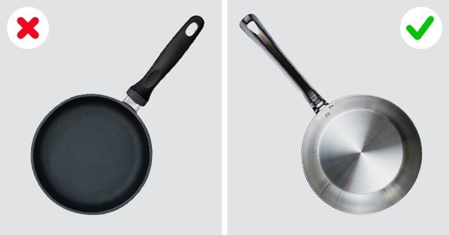 Έχετε παρατηρήσει ποτέ ότι είναι πολύ δύσκολο να μαγειρέψετε κάτι και να δημιουργήσετε μια τραγανή κρούστα σε ένα αντικολλητικό τηγάνι; Ο λόγος είναι η επίστρωση με την μη αντιολισθητική επιφάνεια. Χρησιμοποιήστε αυτόν τον τύπο σκεύους μόνο για τηγάνισμα αυγών και για τηγανίτες. Αλλά εάν θέλετε το κρέας ή τα ψάρια σας να έχουν μια χρυσή κρούστα, αγοράστε ένα νέο τηγάνι χωρίς επίστρωση. Θα νιώσετε τη διαφορά.