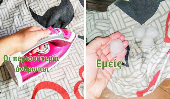Εάν το πλυντήριο έχει λειτουργία στεγνώματος, μπορείτε να χρησιμοποιήσετε αυτό το κόλπο. Προσθέστε παγάκια στο μηχάνημα όταν στεγνώνετε τα ρούχα. Ο ατμός θα εξομαλύνει τις “ρυτίδες” και το ύφασμα θα φαίνεται λιγότερο τσαλακωμένο. Δεν λειτούργησε με πολύ χοντρά υφάσματα, αλλά τα σεντόνια μας βγήκαν πραγματικά υπέροχα.