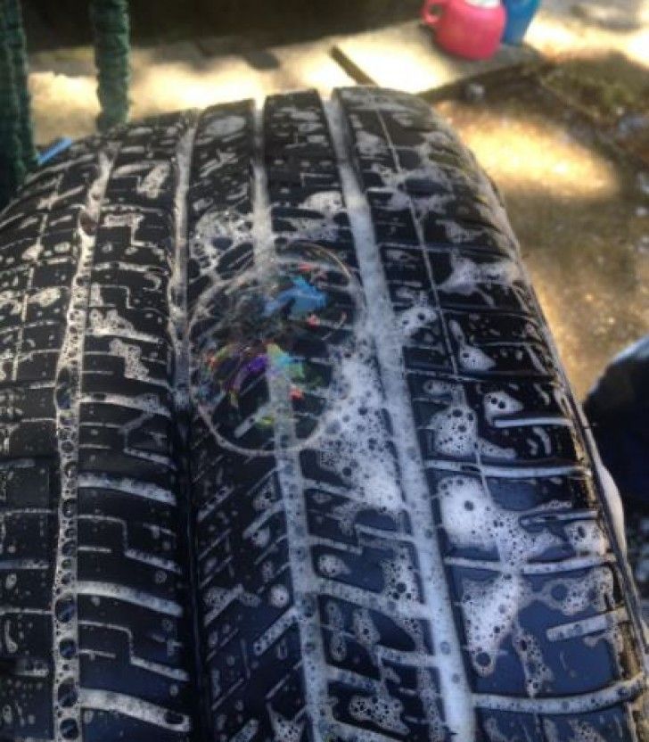 5. Αν το λάστιχο σας έχει τρυπήσει, γεμίστε το με αέρα και μετά πλύντε το με νερό και σαπούνι. Θα σχηματιστούν φούσκες στο σημείο όπου βρίσκεται η τρύπα.