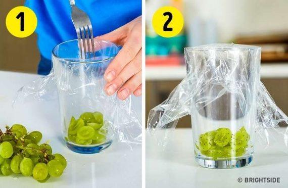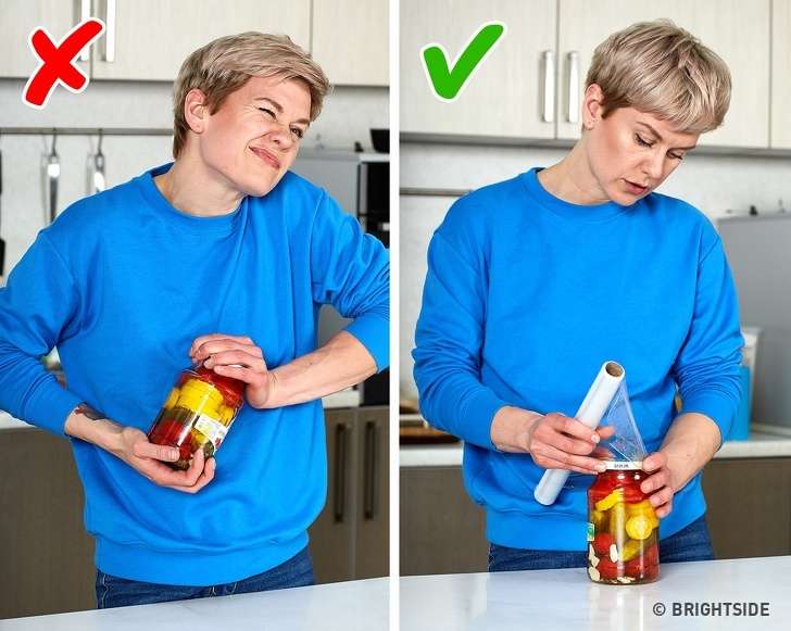 Εάν το καπάκι από ένα γυάλινο δοχείο ή μπουκάλι απλώς αρνείται να… χαλαρώσει, τυλίξτε το με πλαστική μεμβράνη. Αυτό θα κάνει τα χέρια σας να μη γλιστράνε, καθιστώντας το άνοιγμα του δοχείου πολύ πιο εύκολο.
