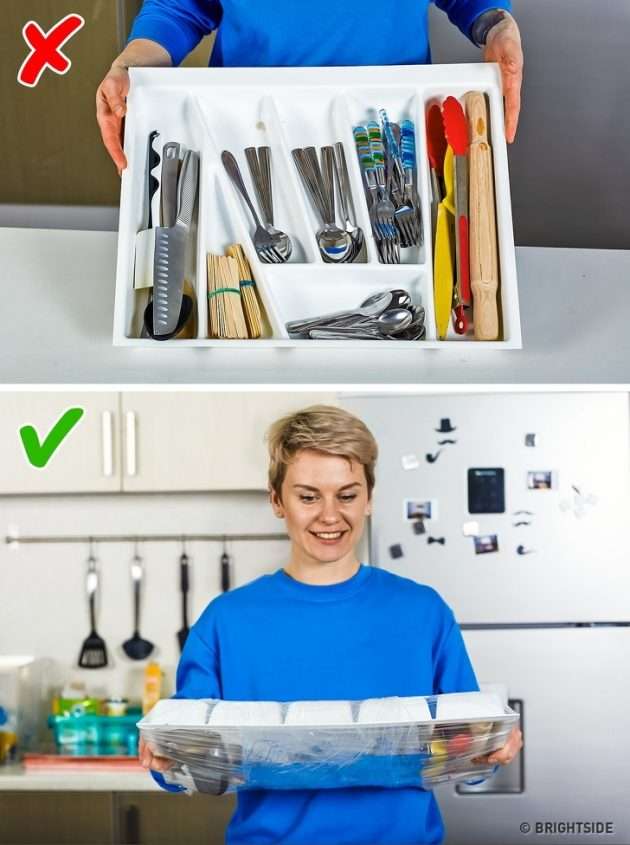 Η μετακίνηση αντικειμένων της κουζίνας θα είναι πιο ευχάριστη με τη βοήθεια της πλαστικής μεμβράνης. Δεν θα χρειαστεί να βγάλετε τα πάντα από τα συρτάρια σας και να τα τακτοποιήσετε ξανά αργότερα. Μπορείτε απλά να τυλίξετε τις θήκες με μεμβράνη, ώστε τα πράγματα να παραμείνουν στη θέση τους κατά τη διάρκεια της μεταφοράς.