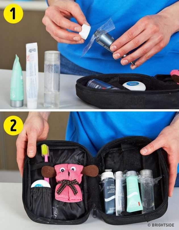 Αν σκοπεύετε να πάτε διακοπές και να πάρετε μαζί σας κάποια υγρά καλλυντικά προϊόντα, αλλά ανησυχείτε ότι θα υπάρξουν τυχόν διαρροές, καλύψτε το πάνω μέρος των συσκευασιών με πλαστική μεμβράνη πριν κλείσετε το καπάκι.
