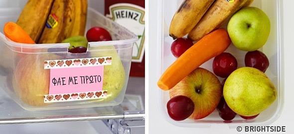 Χρησιμοποιήστε ένα μεγάλο τάπερ ή ένα πλαστικό καλάθι αποθήκευσης τροφίμων για να βάζετε μέσα όσα φρούτα, λαχανικά και άλλα τρόφιμα πλησιάζουν στο τέλος της ζωής τους. Κολλήστε μία ετικέτα πάνω που να εξηγεί ότι τα τρόφιμα που περιέχονται σ’ αυτό το σκεύος, πρέπει να καταναλωθούν πρώτα (όπως «Φάε με!») και… voila!