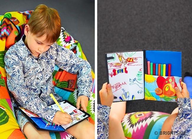 Στο αριστερό μέρος μιας θήκης DVD βάλτε μερικά λευκά χαρτιά (φροντίζοντας να τα κόψετε στο κατάλληλο μέγεθος). Στα δεξιά, φτιάξτε μια τσεπούλα για τους μαρκαδόρους από χαρτόνι (για την πλάτη) και χοντρό χαρτί. Το φορητό σετ ζωγραφικής είναι έτοιμο, για να απασχολήσει δημιουργικά το παιδί στο ταξίδι (και σε άλλες «δύσκολες» στιγμές).