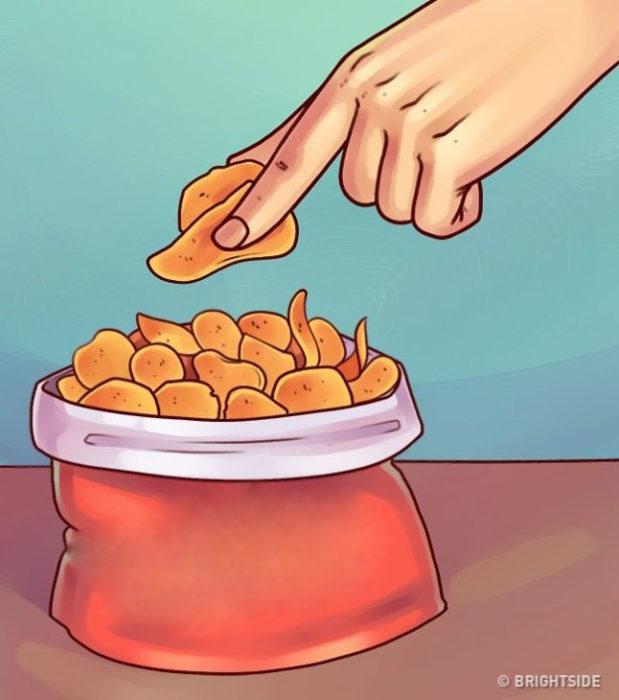 Εδώ είναι ένα έξυπνο κόλπο για να κάνετε τα τσιπς λιγότερο αδέξια και ακατάστατα: Ανοίξτε την τσάντα και ξεκινήστε να την διπλώνετε από κάτω προς τα πάνω καθώς τρώτε, ωθώντας τα τσιπς προς την κορυφή της τσάντας. Με αυτόν τον τρόπο, δεν θα χρειαστείτε να σκάβετε βαθιά μέσα, διασφαλίζοντας έτσι ότι τα δάχτυλά σας παραμένουν καθαρά. Επιπλέον, η αναδίπλωση μιας τσάντας σαν τσιπς δημιουργεί ένα προσωρινό μπολ που μπορεί εύκολα να τοποθετηθεί στο τραπέζι.