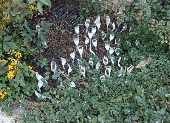 Κρατήστε τα ενοχλητικά παράσιτα και ζώα μακριά από τον κήπο σας, βάζοντας μερικά πλαστικά πιρούνια σε όρθια θέση γύρω από τους λοβούς / φυτά. Αυτό το τέχνασμα λειτουργεί εξίσου καλά στο να σταματάει την ανεπιθύμητη και απροσδόκητη εισβολή των γατών αλλά και των τρωκτικών στο λαχανόκηπο σας.