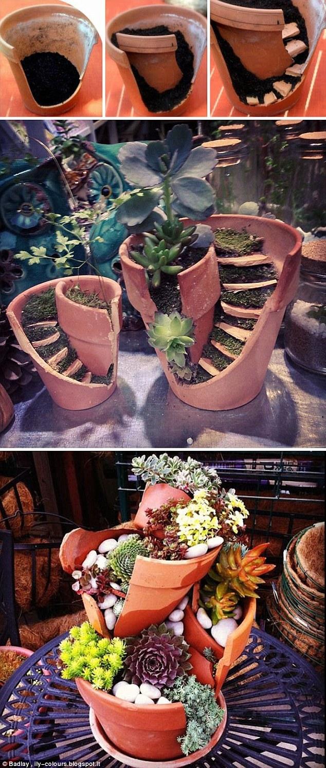 - Μην πετάξεις τις σπασμένες γλάστρες σου, αντ’ αυτού βάλε τα σπασμένα κομμάτια, έτσι ώστε να μοιάζουν με σκαλάκια (ή κάνε έναν συνδυασμό από γλάστρες).