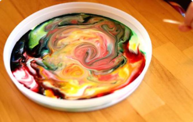 13. Τεχνική μπατίκ: Το απορρυπαντικό για τα πιάτα είναι το βασικό συστατικό αυτού του έργου τέχνης. Γεμίστε ένα μπολ με γάλα και προσθέστε διάφορα χρώματα ζαχαροπλαστικής. Βουτήξτε ένα κομμάτι βαμβάκι στο απορρυπαντικό για τα πιάτα και βάλτε το μέσα στο μπολ. Τα παιδιά θα πάθουν πλάκα με το αποτέλεσμα!