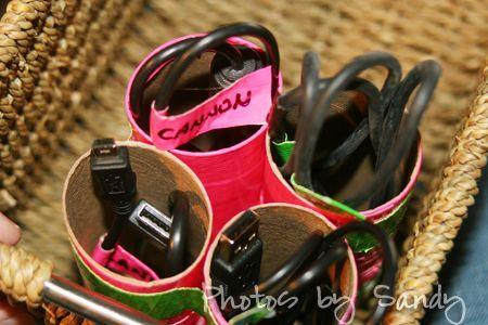 Ένα μπερδεμένο κουβάρι από καλώδια σας κοστίζει χρόνο και μπορεί να οδηγήσει σε φθαρμένα καλώδια που δεν λειτουργούν σωστά. Αυτή η δημιουργική ιδέα χρησιμοποιεί ρολά χαρτιού υγείας για να τα αποθηκεύσετε. Απλά τυλίξτε το καλώδιο και βάλτε το μέσα στο ρολό. Μια ετικέτα στην εξωτερική πλευρά σας εξοικονομεί χρόνο όταν ψάχνετε για ένα συγκεκριμένο καλώδιο.