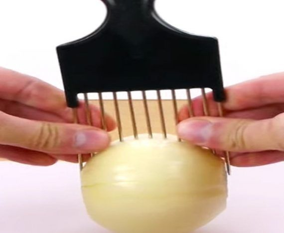 Πόσες φορές έχετε κατακοπεί προσπαθώντας να ψιλοκόψετε τα κρεμμύδια και άλλα λαχανικά για το φαγητό;Έχουμε δοκιμάσει διάφορους τρόπους κατά καιρούς αλλά ποτέ δεν τα έχουμε καταφέρει τόσο εύκολα όσο οι σεφ που παρακολουθούμε στην τηλεόραση.Όχι πια!Παρακάτω θα δείτε τον πιο έξυπνο και πρωτότυπο τρόπο για να ψιλοκόβετε τα λαχανικά χωρίς ατυχήματα. Απλά τοποθετείτε μια μεταλλική πιρούνα για τα μαλλιά στα λαχανικά και κόβετε με άνεση!