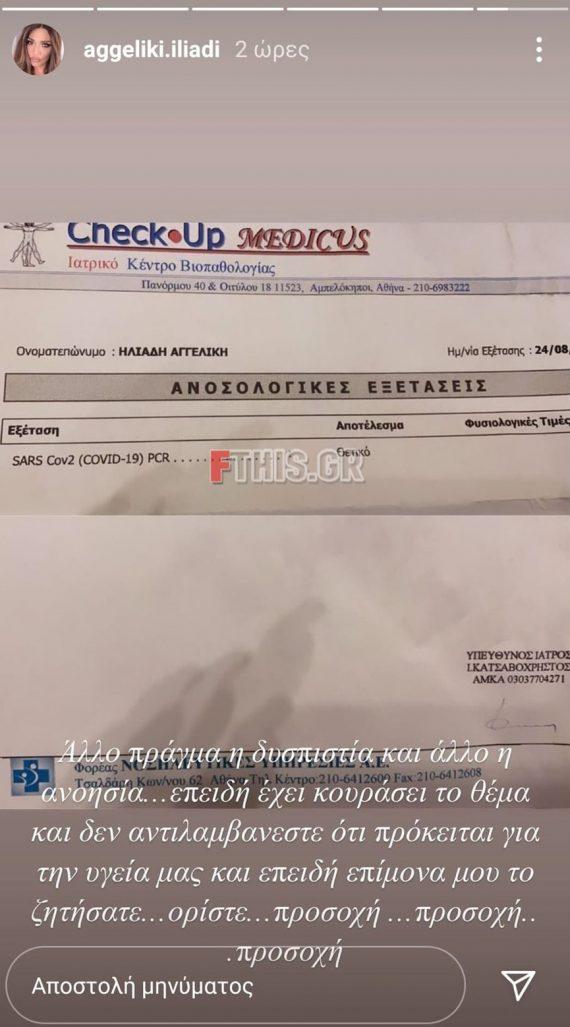 Δημοσίευσε λοιπόν στα instastories τις εξετάσεις με το αποτέλεσμα της διάγνωσης και έγραψε: «Άλλο πράγμα η δυσπιστία και άλλο η ανοησία. Επειδή έχει κουράσει το θέμα και δεν αντιλαμβάνεστε ότι πρόκειται για την υγεία μας και επειδή επίμονα μου το ζητήσατε… ορίστε… προσοχή…. προσοχή…».