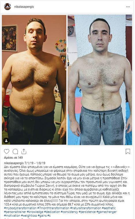 Μέσα σε επτά μήνες έχασε 14 κιλά και πόσταρε κολάζ με φωτογραφίες στο instagram με το πριν και το μετά περνώντας ένα μήνυμα σε όσους δυσκολεύονται να χάσουν κιλά. Ο λόγος για τον Νίκο Απέργη που μας «συστήθηκε» μέσα από τη σειρά «Έλα στη θέση μου».