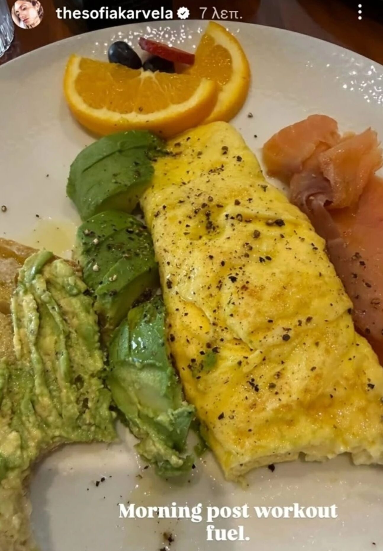 Στην ανάρτηση αυτή, το πρωινό της ήταν ιδιαίτερα ισορροπημένο. Περιλάμβανε ομελέτα με σολομό και αβοκάντο, που είναι πλούσιο σε πρωτεΐνη και καλά λιπαρά, ιδανικό μετά την άσκηση. Το συνοδεύσε με μία φέτα ψωμί και δύο φέτες πορτοκάλι, για φρεσκάδα και βιταμίνες.