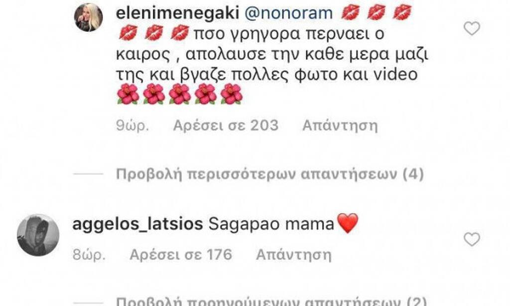 “Μαμά χ’αρη σε σένα είμαι αυτός που είμαι σήμερα!❤Περνάμε αρκετές δύσκολες στιγμές αλλά σημασία έχει να κρατάμε τα ευχάριστα❤ λοβ γιου ρε τρελήηηηη❤❤❤” έγραψε ο Άγγελος στην Ελένη Μενεγάκη.