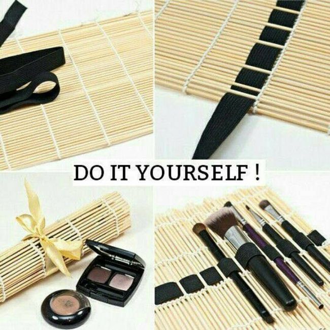 - Μπορείτε επίσης να φτιάξετε μια προστατευτική θήκη για τα πινέλα του μακιγιάζ σας σε μόλις 5 λεπτά. Το μόνο που χρειάζεστε είναι ένα κομμάτι από μπαμπού, ένα μεγάλο λαστιχάκι, λίγο νήμα, και μια κορδέλα.