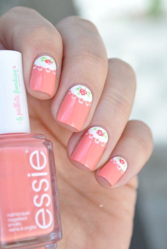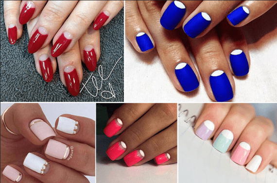 Για μια απλή περίσταση, μπορείτε να χρησιμοποιήσετε παστέλ Half Moon μανικιούρ που περιλαμβάνει αρκετές αποχρώσεις του ροζ και του ροδακινί, ενώ για μια πιο θεαματική εκδήλωση, μπορείτε να δοκιμάσετε να προσθέσετε πολύπλοκα σχέδια από δαντέλα ή στρας. Τα νύχια αυτά είναι φανταστικά ακόμα και όταν χρησιμοποιείτε απλά χρώματα. Από απλές αποχρώσεις του κίτρινου, ροζ , μπεζ με υπέροχα χρώματα του κόκκινου , μωβ η επιλογή των χρωμάτων είναι τεράστια.