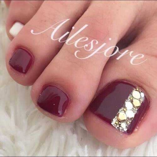 Επίσης, προκειμένου να κάνετε πιο λαμπερά και glamorous πεντικιούρ, θα πρέπει να προσθέσετε μερικές πινελιές χρυσού ή να εφαρμόσετε ένα βερνίκι με glitter. Αν πάλι θέλετε κάτι ακόμη πιο φαντεζί, δοκιμάστε να στολίσετε τα νύχια σας με μικρά τρισδιάστατα κοσμήματα. Εφαρμόστε λοιπόν σε ένα ή περισσότερα νύχια στρας, swarovski και πέρλες και είστε έτοιμη.