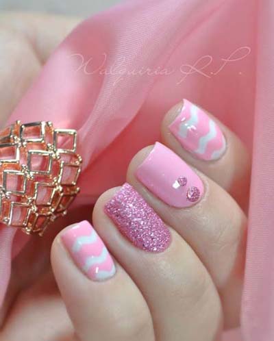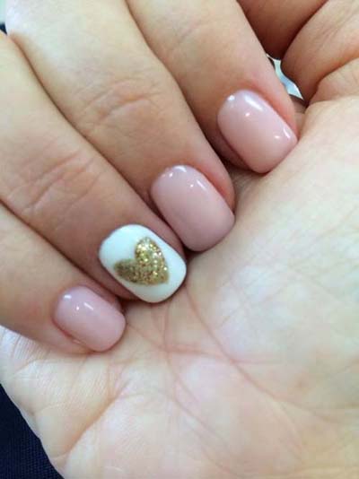 Μια από τις πιο απλές είναι τα ροζ νύχια σε συνδυασμό με ένα λευκό νύχι, διακοσμημένο με χρυσή καρδιά από γκλίτερ.