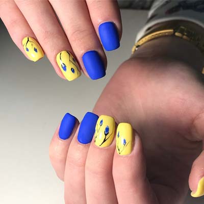 Κάντε λοιπόν ένα μπλε κίτρινο μανικιούρ με φλοράλ, γραμμικά ή άλλα σχέδια και δεν θα το μετανιώσετε!