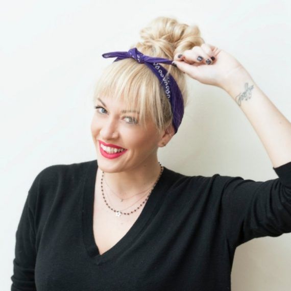 Για να φαίνονται ακόμη πιο φυσικές οι αφέλειές σου πάρε μια μπαντάνα και δεσ’την σφιχτά όπως βλέπεις εδώ. Για να είναι σταθερή βάλε μερικά τσιμπιδάκια πίσω από τα αυτιά.
