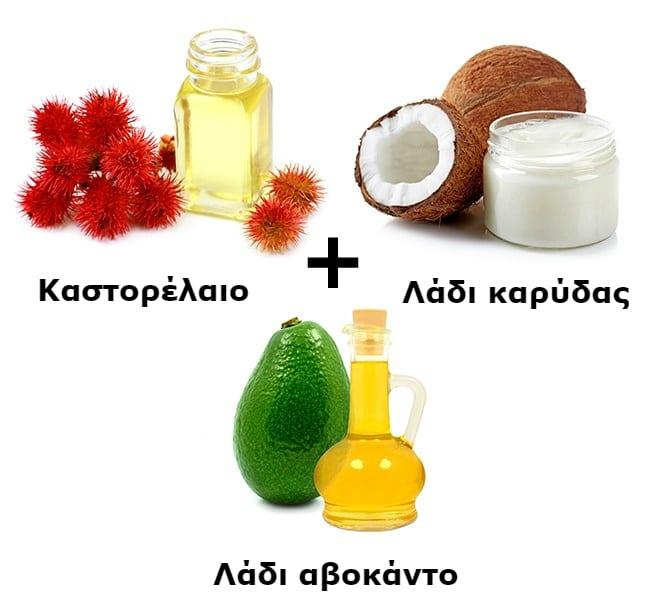 Με αυτή τη συνταγή, μπορείτε όχι μόνο να ενισχύσετε και να μεγαλώσετε τα φρύδια, αλλά και τις βλεφαρίδες. Ανακατέψτε σε ένα μικρό μπουκάλι ίσα μέρη λάδι καρύδας και καστορέλαιο και προσθέστε 1 κουταλάκι του γλυκού λάδι αβοκάντο και ανακατέψτε. Εφαρμόστε το μείγμα στα φρύδια με το βουρτσάκι της μάσκαρας ή με δάχτυλα.