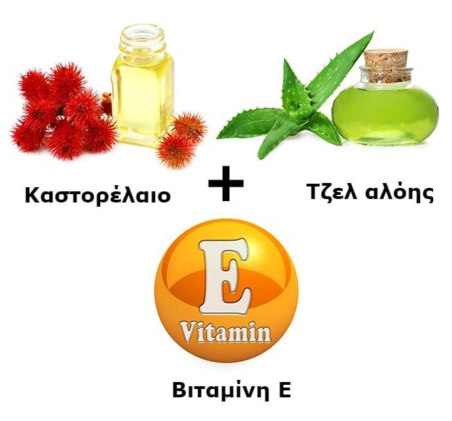 Με αυτό το μείγμα μπορείτε να αποκαταστήσετε τις τρίχες, να τις ενισχύσετε και να τις χαρίσετε λάμψη. Αναμείξτε σε ένα δοχείο 1 κ.γ. τζελ αλόης, 2 κ.γ. καστορέλαιο και 2 κάψουλες βιταμίνη Ε. Εφαρμόστε το μίγμα με βουρτσάκι ή τα δάχτυλα πριν τον ύπνο και ξεπλύνετε μετά το ξύπνημα.