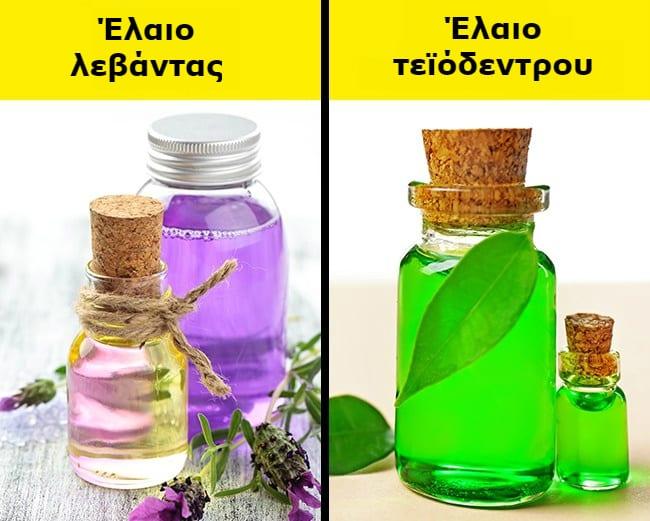 Εξίσου αποτελεσματικό είναι το αιθέριο έλαιο τεϊόδεντρου και λεβάντας, τα οποία είναι γνωστά για τις καταπραϋντικές, συσφικτικές και ενυδατικές ιδιότητες τους. Χρησιμοποιούνται καλύτερα σε συνδυασμό κάποιο έλαιο βάσης (καρύδα, ελαιόλαδο, καστορέλαιο) και για να σιγουρευτείτε, κάντε πρώτα ένα τεστ για αλλεργική αντίδραση στο εσωτερικό του αγκώνα. Εφαρμόστε το μείγμα με τα έλαια στα φρύδια καθημερινά, κάνοντας απαλό μασάζ.