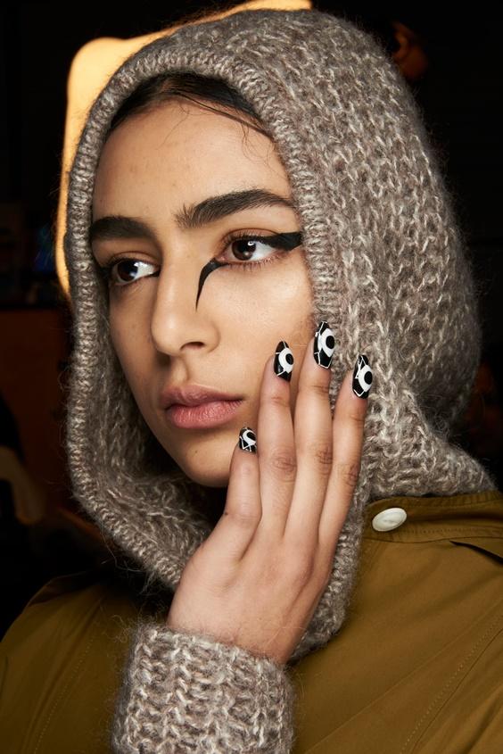 Νύχια που μοιάζουν σχεδόν με…μπάλα ποδοσφαίρου ή ένα ιδιαίτερο ματάκι για καλή τύχη, συγκαταλέγονται στη λίστα προτάσεων της Εβδομάδας Μόδας στη Νέα Υόρκη. Μια extreme επιλογή που μπορεί να σταθεί σε ένα total black μανικιούρ επιλέγοντας το παρακάτω σχέδιο, μόνο για ένα δάχτυλο. Γιατί να μην το τολμήσεις;