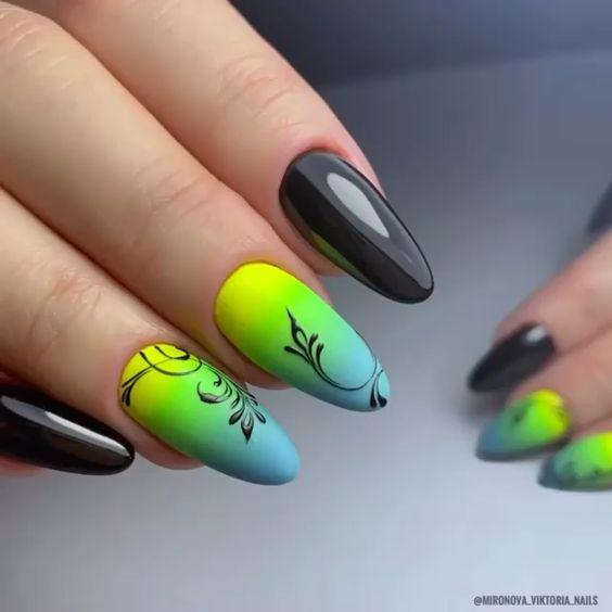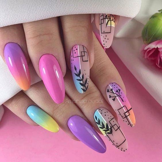 Φυσικά και πρέπει να συνδυάσεις τα χρώματα. Δημιούργησε ουράνια τόξα στα νύχια σου με τις αγαπημένες σου αποχρώσεις και απογείωσε ακόμη περισσότερο την εικόνα, μέσα από τα περίτεχνα σχεδία που θα διαλέξεις! Η παρακάτω εικόνα είναι από τις αγαπημένες μας!
