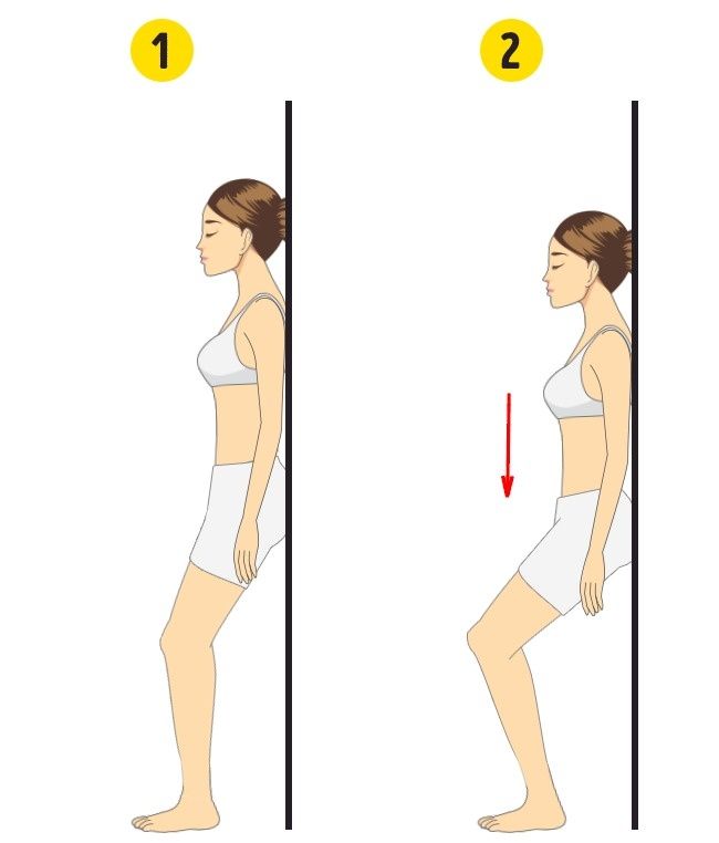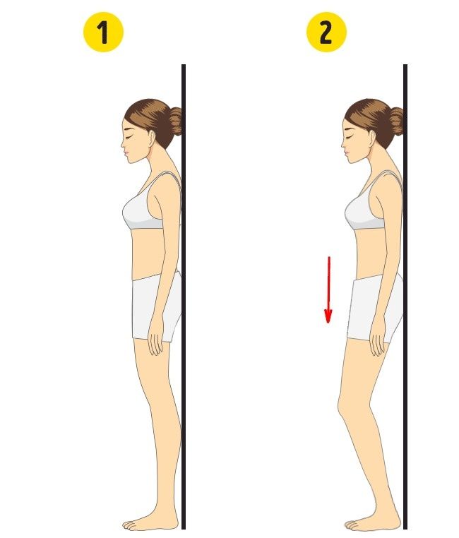 Στερεώστε την πλάτη σας σε έναν τοίχο και κρατήστε τα πόδια σας περίπου 35-40 εκατοστά μακριά από τον τοίχο. Αργά ξεκινήστε να πιέζετε τους γλουτούς σας στον τοίχο λυγίζοντας τα γόνατά σας στο βαθμό που νιώθετε άνετα. Το χαμηλό σημείο της πλάτης σας πρέπει να πιέζεται στον τοίχο και δεν πρέπει να αισθάνεστε οποιαδήποτε δυσφορία κατά την άσκηση. Επαναλάβετε την άσκηση αρκετές φορές.