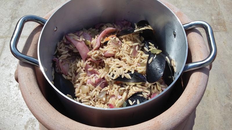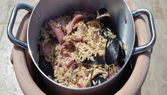 -θαλασσινά με κριθάρι, σταφίδες και ελιές (για τη φωτιά) και