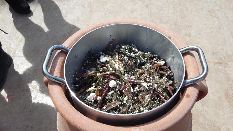 -πικρά χόρτα με θαλασσινό νερό, βερίκοκα, κατσικίσιο τυρί και ξύδι (για το νερό),